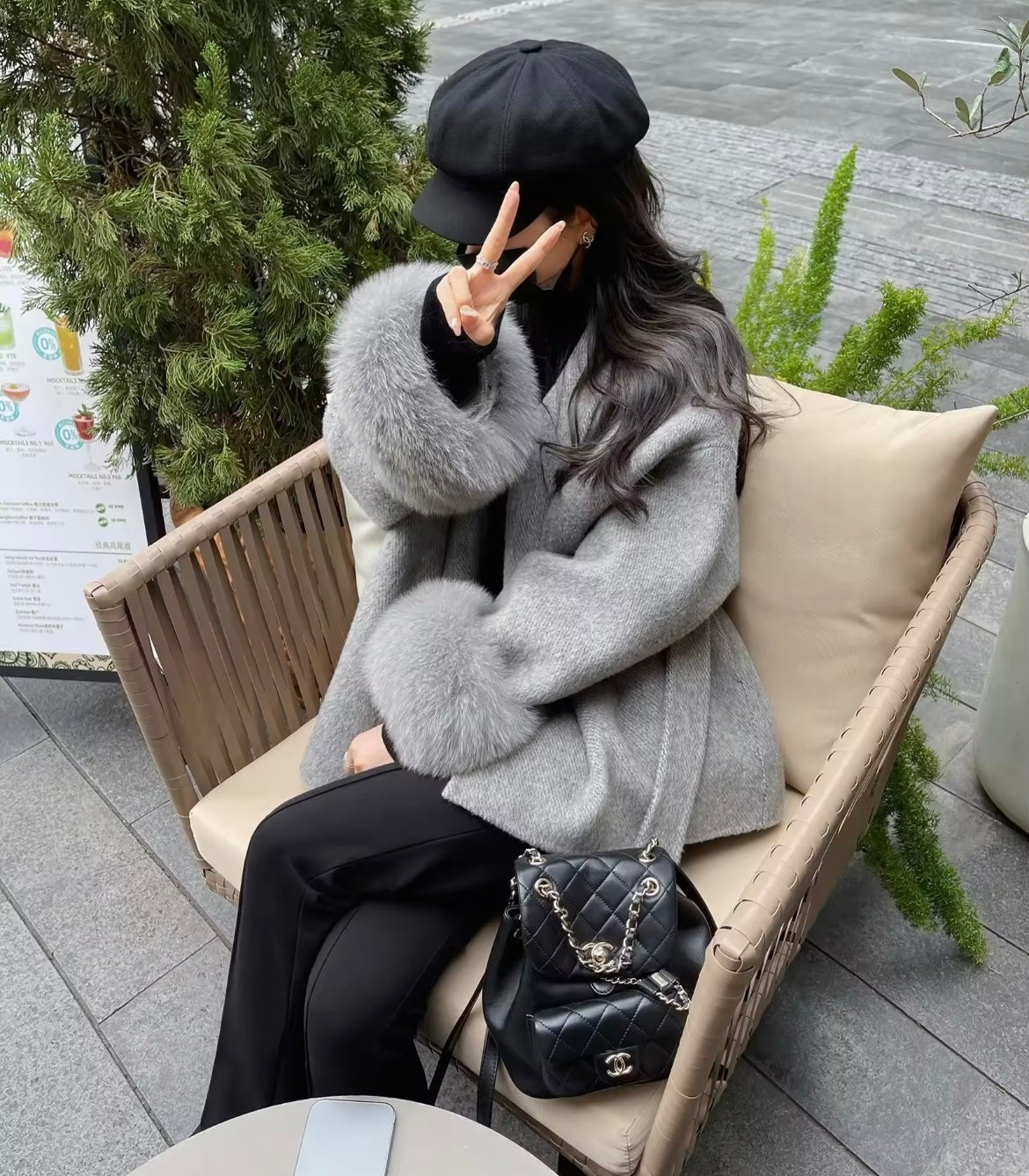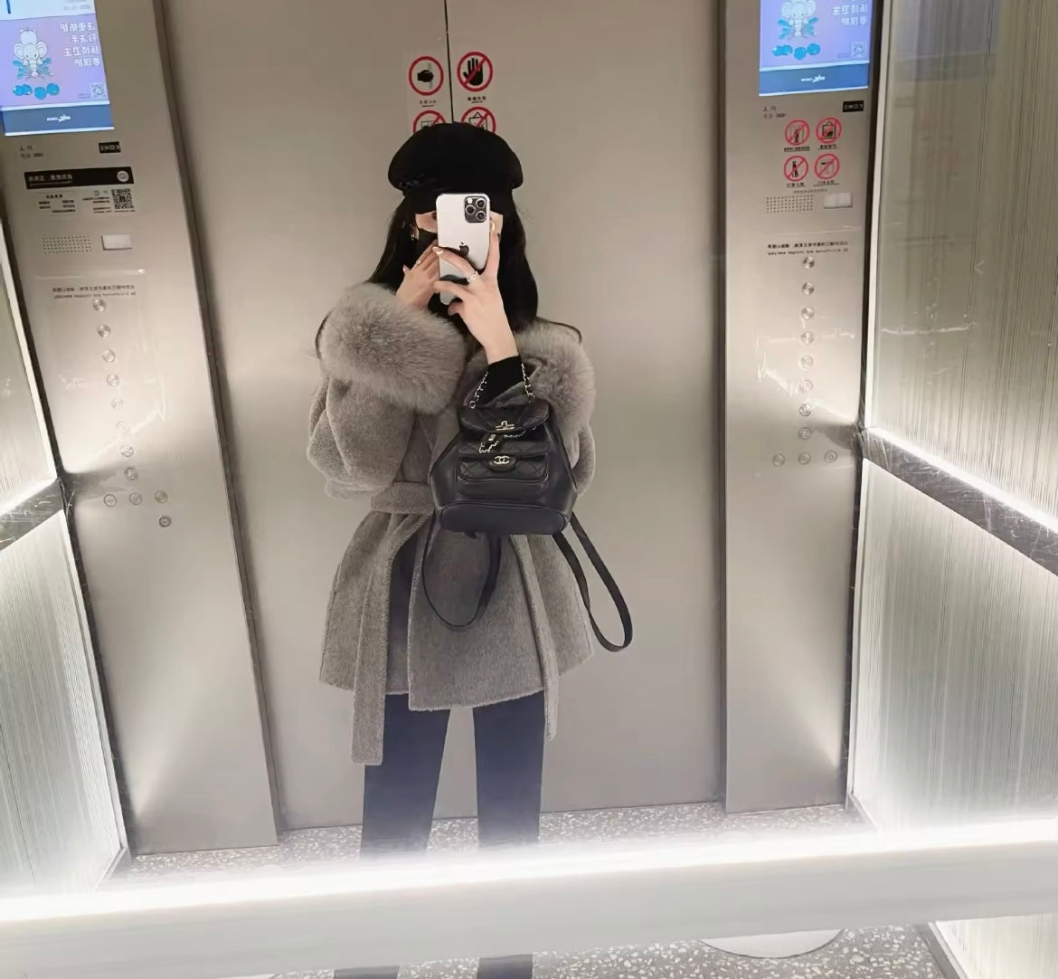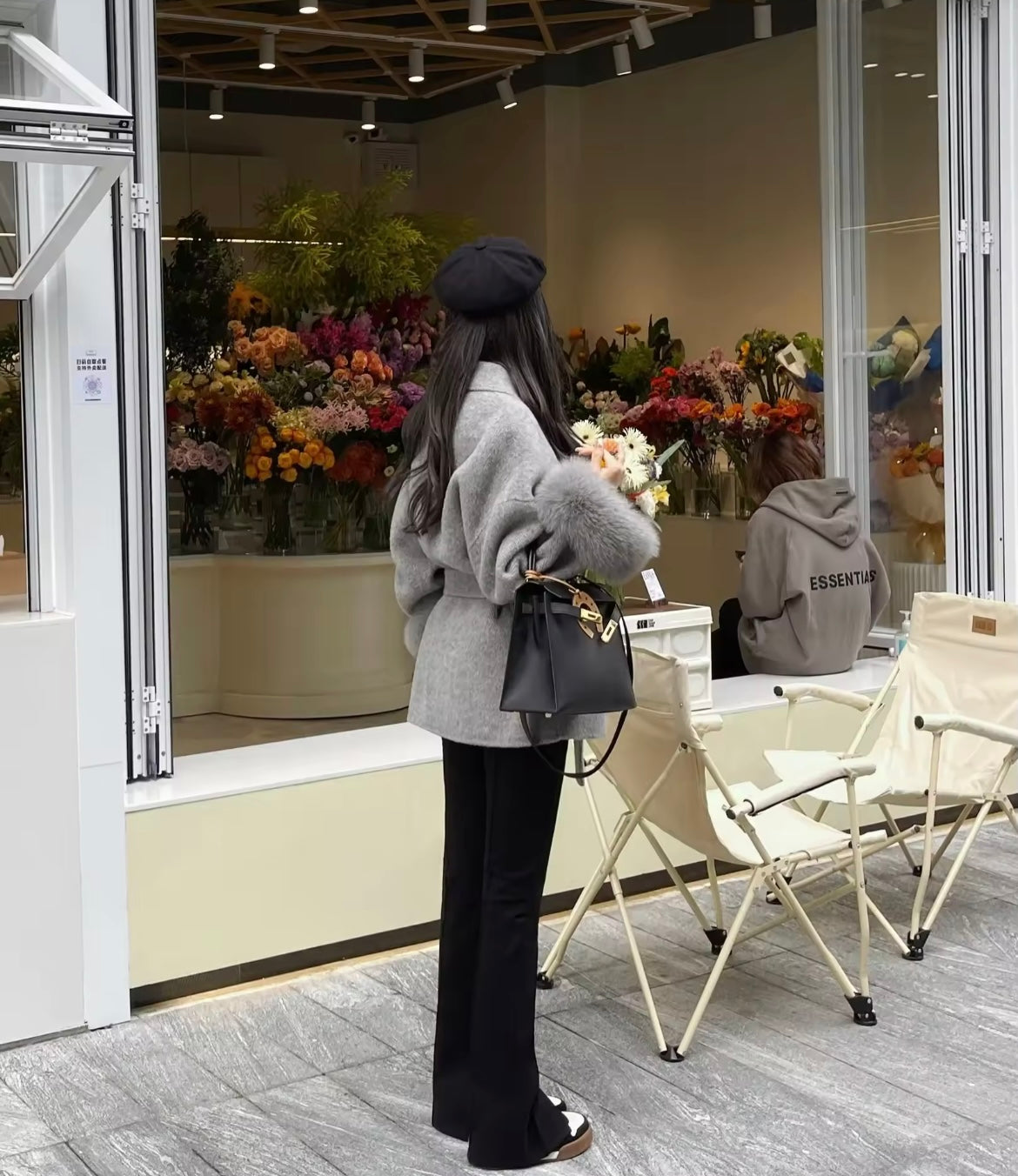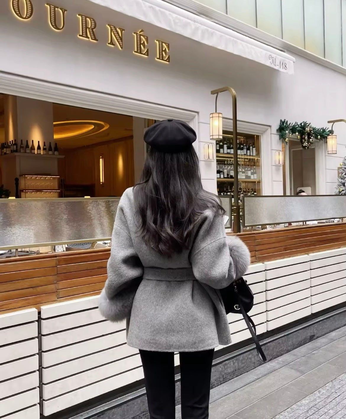 كوت من الصوف مع حزام وفرو عند الاكمام