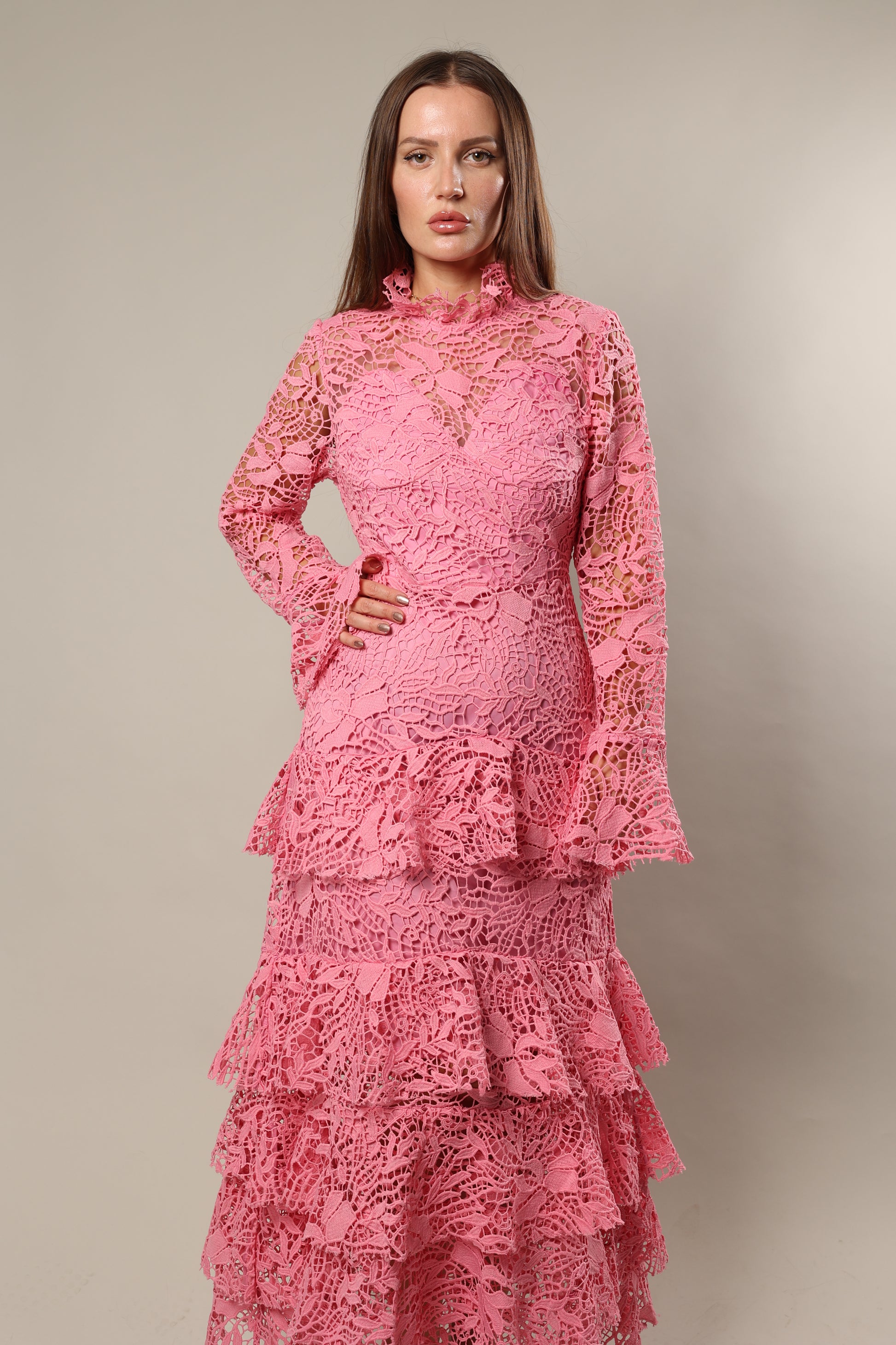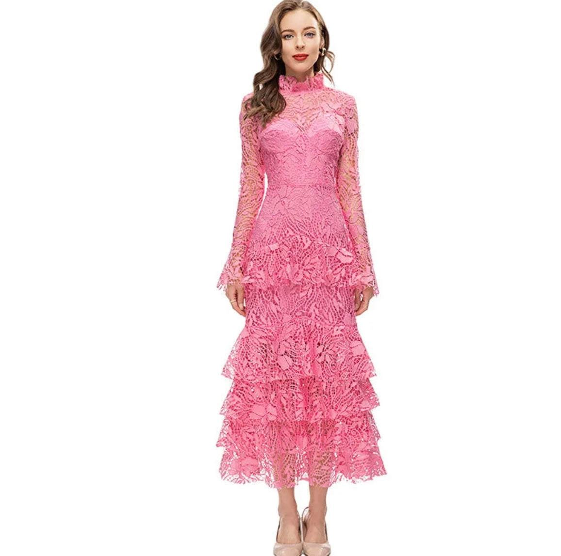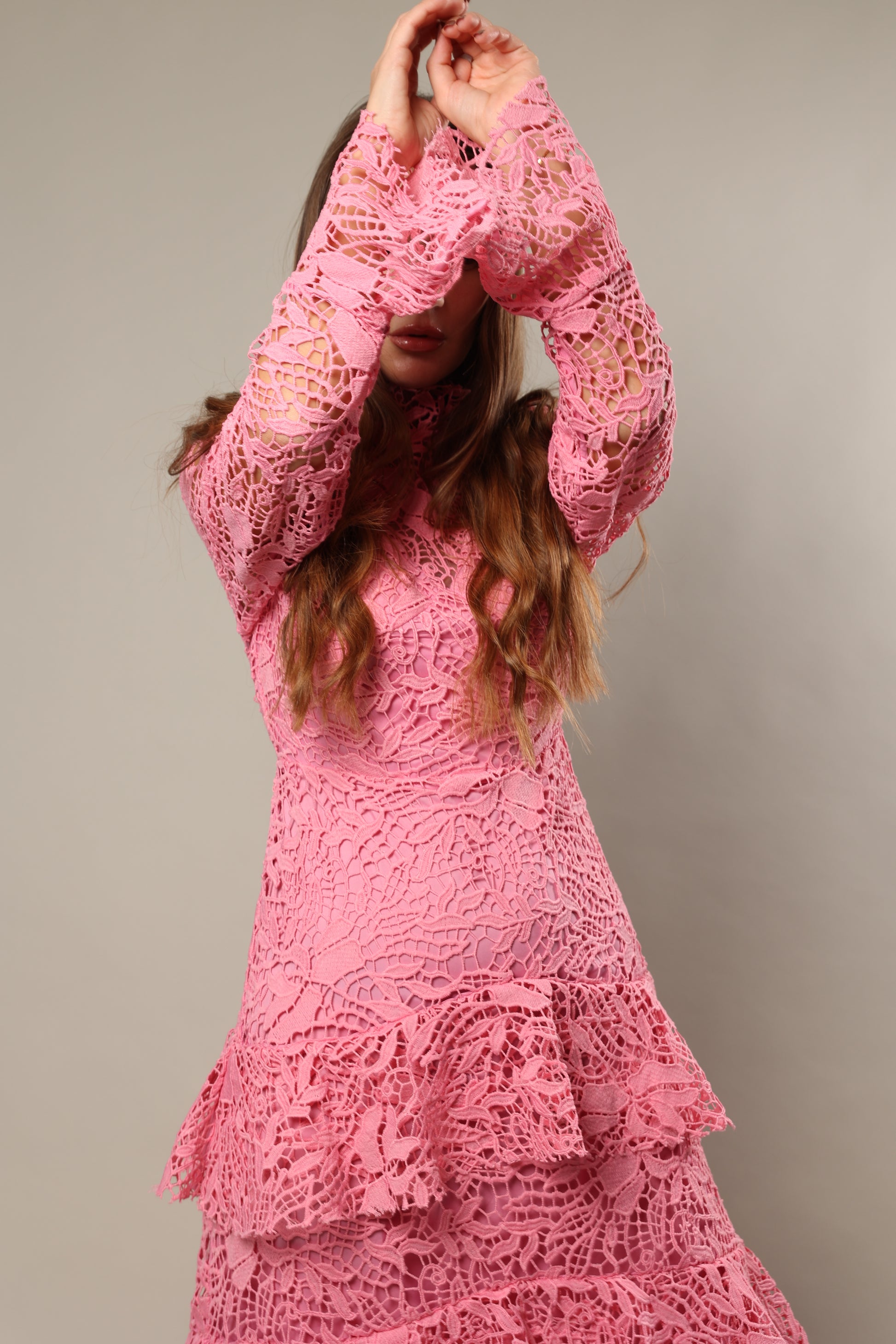 فستان الاكمام الطويله من الدانتيل الوردي